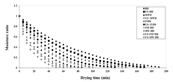 First, HD tests were performed to dry the carrot slices and considered as the standard for evaluation. Then, the effects of other dryers (single, hybrid and with US pretreatment) on the carrot slice drying were evaluated by studying the drying kinetics (drying time) (Table 4). Figure 1 shows the drying kinetics of the carrot slices dried by different dryers. Evidently, HD drying took significantly longer than the other methods (190 ± 10 min) (p < 0.05). According to Table 4, the use of MWD and INFD resulted in the faster drying process (55% and 23%, respectively). The use of MW radiation significantly affected the drying kinetics and accelerated the evaporation [31]. When INF–HD and MW–HD were employed, the carrot slices were dried at a higher pace at 28% and 50%, respectively. This shows that both MW radiation and INF illumination can accelerate the evaporation process. INFD and MWD waves, in combination with HD, can penetrate into the product and produce heat at the water sites, and this will displace the moisture from the center to the surface [29].