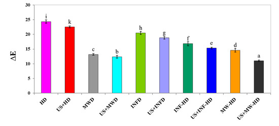 The color of the biological products is one of the major indices in the evaluation of the heat-induced damages. In marketing, color is one of the main concerns in product acceptance by consumers [45]. As a result of the study, the highest color variations (24.37 ± 0.57) were observed in HD method (p < 0.05). In these dryers, the product color became darker due to the long drying process. Moreover, the prolonged drying process also enhanced the level of non-enzymatic browning reaction, hence, elevating the color variation [3]. As suggested in Figure 3, the lowest color variations (11.02 ± 0.27) were observed in the samples dried by US+MWD–HD (p < 0.05). The application of US pretreatment decreased the color variation in all the tested methods. As the lower color variation indicates the better performance of the drying process in preserving the product color, it can be said that the best color quality of the carrot slices can be achieved by US pretreatment combined with MW–HD which can be attributed to a higher drying rate of the mentioned method [46].