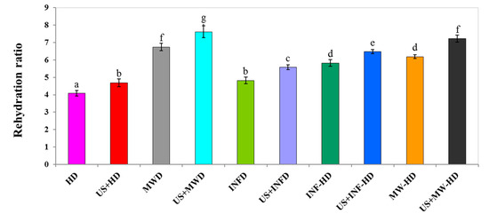 HD took a relatively long drying time resulting in higher cellular damage and hence, the lowest rehydration. The highest rehydration ratio was observed in US+MWD (7.61 ± 0.34) (p < 0.05). Regarding the dependence of the rehydration on the cellular and structural damage extent and porosity level, it can be concluded that US+MWD caused lower damage to the texture and by causing more porosity increased the rehydration of the carrot slices [51]. Moreover, according to Figure 5, the US-pretreated samples exhibited higher rehydration values. Therefore, it can be concluded that US pretreatment reduced the textural damages and formed microscopic channels in the carrot slices [36]. Similar effects of US pretreatment were reported on the carrot, pear slices, and kiwifruit by Wiktor and Witrowa-Rajchert [52], Liu et al. [53], and Wang et al. [54], respectively.