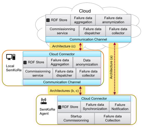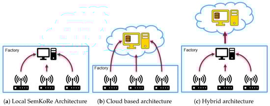 - A SemKoRe Agent: Runs on industrial IoT gateways connected to the machines. It collects data when failures occur in the connected machines. According to the chosen architecture, the collected data are then shared with either the SemKoRe Server or Local SemKoRe. The SemKoRe Agent is designed to fit in all architectures (see Figure 1).