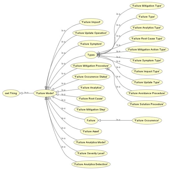 - Define classes and class hierarchy: Several classes were created including the important terms listed above. However, since no specialization concept will be introduced, the ontology is flat. Only the classes relative to types (e.g., Failure Type, Symptom Type) are grouped as sub-classes of the Types class.