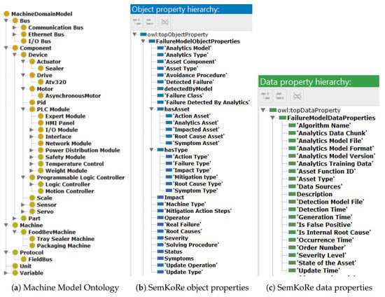 In addition to the failure ontology, we also created a machine domain ontology (Figure 4a) to describe the machine components to satisfy our requirement to link failures to specific machine components when and where they occur, as simply knowing about a failure is not useful on its own. We also need to identify the components that caused a failure or that show failure symptoms, so that they can be identified as candidates for repair or inspections. For simplification, we only described two types of machines in our machine domain ontology, a Tray Sealers Machine and a Packaging Machine. Each machine type is composed of many components (PLC, Drive, Actuator, Sensor, and others), connected through different communication buses. To integrate both ontologies, we created OWL Class FailureAsset, to associate failures to the corresponding components in the machine domain ontology.