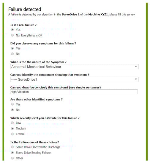 This part collects the failure information using an ordered set of predefined questions. It facilitates the collection of perceptible symptoms of the failures as well as the reporting of new symptoms and failures. During our interactions with machine domain experts, we found that the content of the survey is strongly correlated with the machine types and the kinds of failures they encounter. Our on-field interactions with the operators, technicians and experts highlighted the importance of an intuitive user interface.