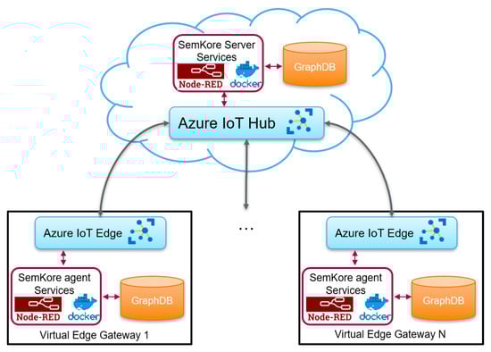 - Microsoft Azure: The SemKoRe Server services are hosted on Microsoft Azure, which provides high-performance cloud services. The server uses Azure IoT Hub [31] to connect the IoT devices to the cloud using several communication protocols, including the MQTT (Message Queuing Telemetry Transport) messaging protocol [32], which we used to simplify the data flow transmission between our SemKoRe agent and server services. For the edge, the Azure IoT Edge service was used to easily connect the edge gateways to the cloud via Azure IoT Hub as shown in Figure 7.