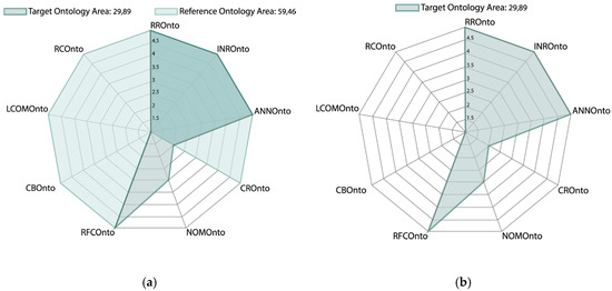 As shown in Figure 8a, the evaluation of the quality of Ontologies is made in the form of a radial chart combining different quality measures. The quality is shown in a dashboard which includes “Base Metrics” (located at the top of the figure), which include the number of classes, subclasses, properties, instances, and annotations of the ontology to evaluate and compare with the reference ontology (optional). The bottom of the dashboard contains a quality evaluation chart that perceives the quality of the ontology at a simple glance. The chart represents RROnto, INROnto, ANNOnto, CROnto, NOMOnto, RFCOnto, CBOOnto, LCOMOnto, and RCOnto scores (see Table 2), achieved by the ontology. Additionally, the area of the figure described by the representation of these measurements (that is also shown) could be used to assess the global quality of the ontology. Finally, the knowledge engineer can graphically visualize the ontology itself if desired.