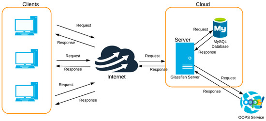 As shown in Figure 2, user interaction takes place through a web browser, sending HTTPS requests to a Glassfish application server running in the cloud. Persistence is supported by a Spring ORM (object relational mapping) implementation that transparently manages the information stored in a MySQL database engine. Additionally, the external RESTful Web Service (OOPS!) [24] API is used for the evaluation and detection of errors in the ontologies. Figure 3 shows a set of technologies separated into different layers, in order to delegate specific functions for each of them, promoting the software development single responsibility principle [25]. Each of the technologies was specially selected for the development of OntologyFixer, for its ease of integration, robustness, and availability as open source software.