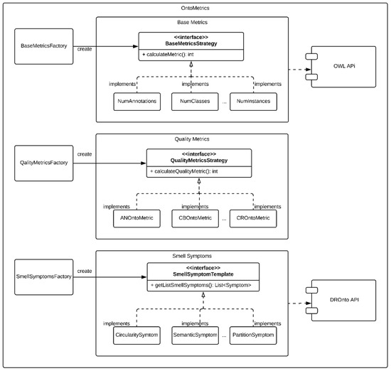 The development of this API involved the use of some design patterns that facilitate software comprehension, maintenance, and evolution. The behavior pattern strategy [30] was used to define a family of algorithms, each of them in separate classes, making their objects interchangeable. Figure 5 shows the design of the OntoMetrics API package.