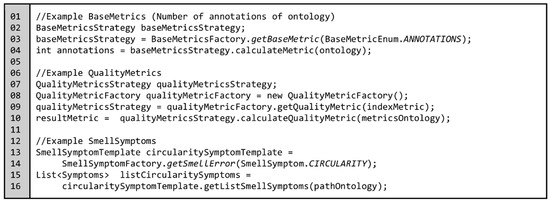 As shown in Figure 5, the implementation of the package includes a Strategy interface, implemented by strategy classes for basic and quality metrics. Moreover, the Template pattern [30] was used to implement smell symptom identification. Finally, we used the Factory design pattern [30] for creating objects, without having to specify their exact class. This Creational pattern avoids close coupling between the creator and concrete products. In addition, it complies with the principle of sole responsibility because it can move the product creation code to a specific place (the Factory class) in the program, making the code easier to maintain. In addition, by combining the selected patterns, the use of the metrics is clearly easier for developers. Figure 6 shows different examples of using the metrics included in the library.