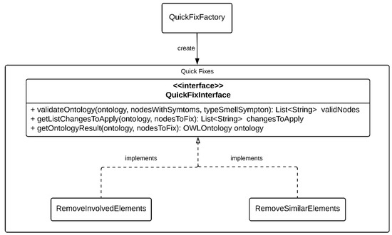 Another of the main features of OntologyFixer is the possibility of applying quick fixes. The application was designed with an architecture that allows for the easy addition of new quick fixes, to improve ontologies. Figure 7 shows the QuickFixInterface interface, which specifies the methods that should be implemented to develop additional quick fixes.