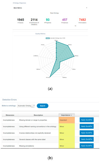 Ontologies are knowledge representations, in which concepts and categories of a certain domain are stored together with their properties and the relations between them. Currently, ontologies are used to represent knowledge from a large number of domains in order to solve different problems and improve the experience of users in different contexts. For example, in the Semantic Web, they are used to describe terms, retrieve information, and interconnect web services. Due to the increasing use of ontologies, a large number of models and languages have been introduced to manage them, including resource description framework (RDF) [1], resource description framework schema (RDFS) [2], and ontology web language (OWL) [3], among others. However, it is necessary to be able to evaluate the quality of the creation of these ontologies in order to guarantee good performance, and take advantage of the benefits they offer. Currently, ontologies facilitate aspects such as communication, interoperability, and automatic reasoning [4,5,6,7]. Ontologies allow us to represent and share knowledge using a common vocabulary, and to exchange data between different systems and contexts [8].
