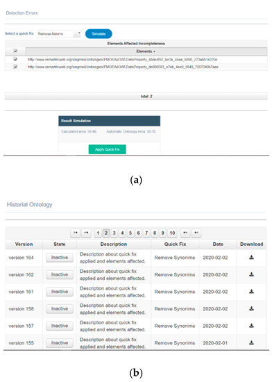 Figure 9a shows the “Apply Quick Fix” button, which allows the execution of a quick fix to those elements of the ontology (instances, classes, relationships) affected by some type of issue. This button is used to compute the list of all affected items for an error. As shown in Figure 9a, OntologyFixer users can select one or more elements found, and apply one of the quick fixes described in Section 3. One of the functionalities of OntologyFixer is the possibility of simulating the results of applying a quick fix, which is useful for deciding whether to apply a certain solution. The simulation result shows a value for the current area and the new area calculated after applying the quick fix in the ontology (Figure 9a). Finally, the “Apply Quick Fix” button shown in Figure 9a will generate a new version of the ontology and store it as a new version in history.