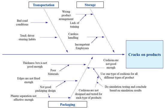 Problem clarification–root cause analysis: The crack report of a GPEM industry partner shows the increasing percentage of the cracked packages from the pre-shipment stage to customers’ storage checking. Cracks appear on the rim, body, and also the bottom of products. These problems happen to different types of products. In general, the higher percent of failure ratio, the more cost penalty the manufacturer has to pay. Because of the damaged product, the company has to be responsible to customer for warranty or change the new product. Especially, from the first three months—the highest market demand duration this year, the cracks at the body, bottom, and top of the products is 1.64%, which is extremely high compared to previous periods. There may be a consequence of bad packaging methods or wrong manipulation that leads to ongoing problems. In addition, current consumers and industry trends which prefer using sustainable materials for packaging also put the company in the need of improving the packaging sustainability. Therefore, finding the materials and packaging methods which are friendly to the environment and still ensure bringing profit for the company are in urgent need. Table 2 is an example of how the team recorded and analyzed the actual situation to identify current problems in packaging.