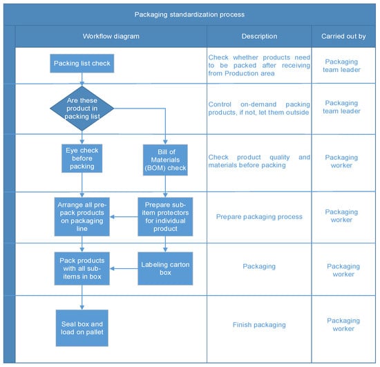In this case study, the new packaging design will be widely implemented for mid-weight (under 15 kg) and round shape products. A packaging standardization process is developed with detail task assignments (Figure 6). For the large weight (above 15 kg), the solution was not totally successful, the team rejected to applied it. Another PDCA cycle will start again to dive further into tackling the problem.
