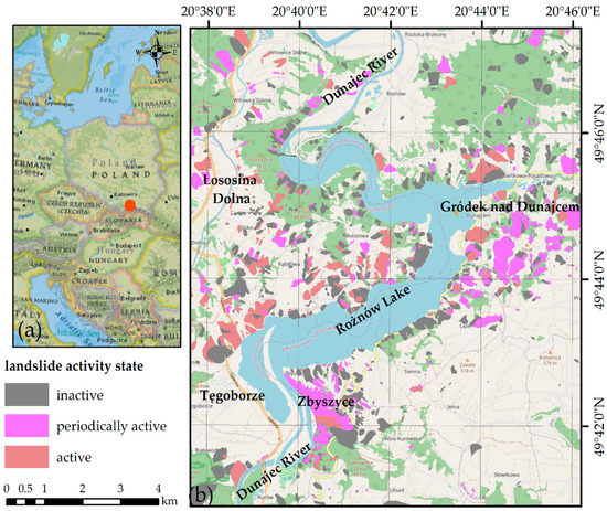 The study area is located in the Outer Carpathians in the Małopolskie voivodeship. The main river of Dunajec is located in the study area, and Rożnów Lake was created as result of damming the Dunajec River. This dam is used in the Rożnów Power Plant [30]. The Rożnów water reservoir is one of the main elements for managing the water resources of the Dunajec river basin. (Figure 1). The study area covers from 49°40′ N to 49°46′ N latitude and from 20°38′ E to 20°48′ E longitude, which corresponds to 136 km2 (Figure 1). Around 18.2 km2 of this area is affected by landslides. According to Varnes’ classification, updated by Hungr et al. [31], all landslides have a slide type of movement. According to Hungr’s classification [31], within the Łososina commune, there are rock rotational slides (no. 6), clay/silt rotational/planar and compound slides (no. 11, 12, 14). Unfortunately, the landslide inventory provided by Polish National Geological Institute does not represent more detailed characteristic of landslide types e.g., shallow/deep-seated landslides or planar/rotational slides. Generally, landslides are classified as deep or shallow based on the material, movement mechanism and depth of the rapture surface [32]. The authors of [33,34] reported that landslide is considered as shallow when the depth of the sliding plane is less than 10 m and deep seated when sliding plane is deeper than 10 m. When investigating sizes [35,36], characteristics and slip depth of some landslides described in the landslide inventory documentation [37,38], we can concluded that shallow as well as deep seated landslide exists in investigated region. Generally in this region, landslides are slow- to very-slow-moving. The study area mainly consists of Eocene–Oligocene sandstones and shales and Upper Cretaceous sandstone and conglomerate–Lower Stebna layers. This is one of the most landslide-affected areas in Poland. Additionally, due to the complex geological conditions, landslide inventories in this region of the eastern shore of Rożnów Lake were unavailable for a long time. Thus, its situation suited the research question of this paper.