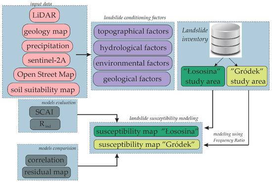 The methodology flowchart is presented in Figure 2. The study area was divided into two regions called “Łososina” and “Gródek”, separated by Dunajec River (also the boundary of the Łososina and Gródek communes). These regions were used for cross-modeling. This means that in the first model, “Łososina” was used for modeling, while in the second, “Gródek” was used for the modeling of the landslide susceptibility of the entire study area. The official national landslide inventory map (SOPO) was used for LSM. The Frequency Ratio (FR) method was applied as a tool for landslide modeling. The susceptibility assessment was performed in the same manner by using various landslide input data. Based on this, a direct comparison between these two strategies was possible. More detailed descriptions of data and methods used are presented in the following subsections.