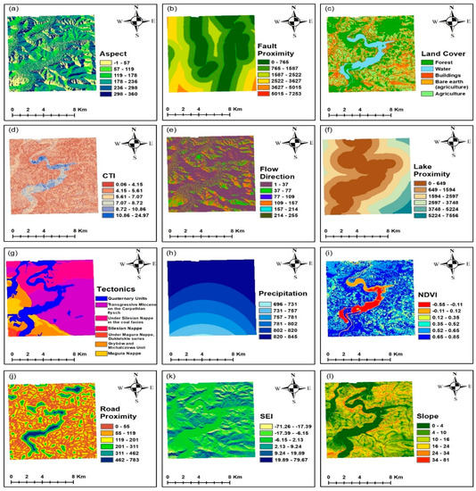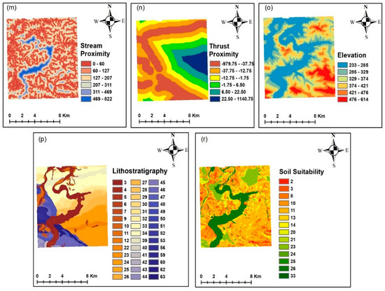 Examples of landslide conditioning factors utilized in this study (a) aspect, (b) fault proximity, (c) land cover, (d) CTI, (e) flow direction, (f) lake proximity, (g) tectonics, (h) precipitation, (i) NDVI, (j) road proximity, (k) SEI, (l) slope, (m) stream proximity, (n) thrust proximity, (o) elevation, (p) lithostratigraphic units, (r) soil suitability.