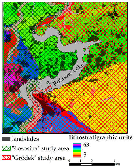 Study area division into “Łososina” region and “Gródek” region superimposed on lithostratigraphic units.