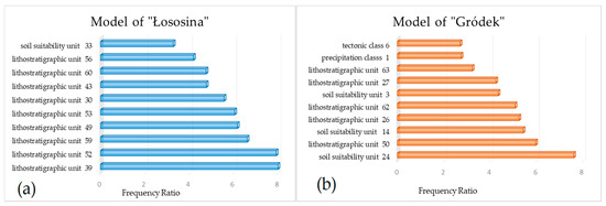 The frequency ratios for the first and second models are presented in Appendix A and Appendix B, respectively. Observing the FRs, it is apparent that the topographic factors were not of great importance for the preparation of the LSM in this study. To the contrary, it can be observed that the lithostratigraphic units were more important than tectonics or other geological or environmental conditioning factors. For clarity, the ten highest frequency ratios achieved for each model are shown in Figure 5, from which it is clear that the lithostratigraphic units were the most important variable in both models. Soil suitability also played an important role in landslide occurrence. In the “Łososina” model, precipitation and tectonic were also important landslide-controlling factors.
