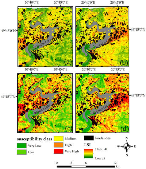 Landslide Susceptible Index (LSI) and landslide susceptibility zones for the (a,c) “Łososina”-based model and (b,d) “Gródek”-based model.
