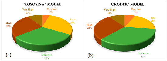 The results from the “Łososina” model show that the very low, low, moderate, high and very high landslide susceptibility zones of the LSM cover 5%, 10%, 28%, 31% and 26% of the investigated study area, respectively (Figure 7a). The “Gródek” model results show that the very low, low, moderate, high and very high landslide susceptibility zones of the LSM cover 7%, 20%, 35%, 28% and 10% of the investigated study area, respectively (Figure 7b). From these indices, the same quantity can be observed for very high and high susceptible classes. Some relatively high differences can be observed within the low susceptibility class.