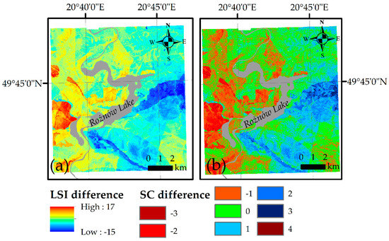 Difference between “Łososina” model and “Gródek” model for (a) Landslide Susceptibility Index (LSI) and (b) susceptible class (SC).