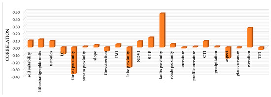 To better investigate the difference between these two models, a correlation matrix between the difference in the LSI index (Figure 8a) and each LCF was calculated and is presented in Figure 9. Based on this, it can be concluded that this difference between the models highly corresponds to the fault, lake, and trust proximity. It can therefore be deduced that the landslides used for modeling did not capture the variability of geological (thrust and fault proximity) and environmental (lake proximity) conditions. Landslides that are better distributed across the entire study area can better describe the variety of geological and environmental conditions (e.g., thrust, fault and lake proximity) and therefore better predict landslide susceptibility.