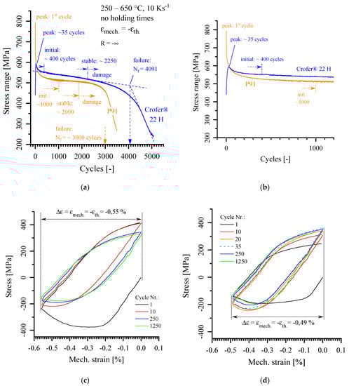Figure 3a displays typical thermomechanical fatigue life curves of the ferritic-martensitic grade 91 and ferritic Crofer®22 H steels from oop cycles with complete (100%) obstruction of thermal strain (i.e., the specimen faces compressive stress during heating up to the hot end of the cycle and tensile stress during cooling down to the cold end). Figure 3b in detail depicts the initial phases of both the materials up to 1200 cycles. In Figure 3c,d the associated stress-strain hysteresis loops are given.