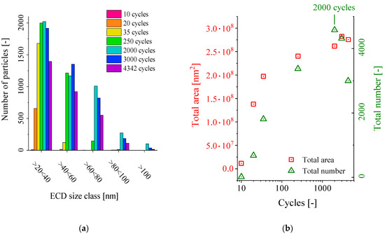 Evolution of Laves phase particle population in ferritic Crofer®22 H steel during TMF cycling: Size classification by equivalent circle diameter (ECD) (a) total particle area and number (b).
