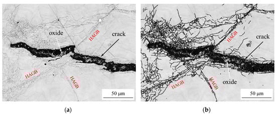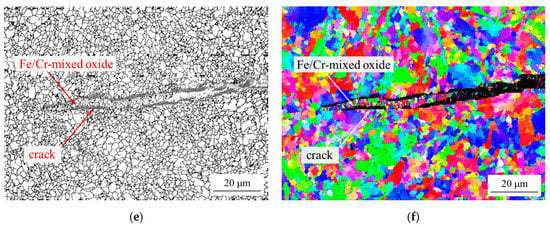 In Crofer®22 H, damage is induced at 1993 cycles (Figure 3a, Table 2). Crack nucleation and propagation are typically transgranular (Figure 9 and Figure 10). Formation and migration of sub-grain boundaries in the grain interiors is hindered by the intragranular Laves phase precipitates. Polygonization phenomena for this reason are constricted to areas of large plastic distortions, like slender zones along fatigue crack edges (~50–60 µm, cf. Figure 9b) and PFZs, in which dislocation pinning by precipitates is not effective enough along high-angle grain boundaries (Figure 9b). Crack progression is furthermore obstructed by precipitates in front of cracks, which prevent the formation of sharp crack tips (Figure 9 and Figure 10) and in this way contribute to the described decrease of stress range degression per fatigue cycle in comparison to martensitic P91. The higher cyclic hardening potential and increased damage tolerance of Crofer®22 H is analyzed in detail in [].