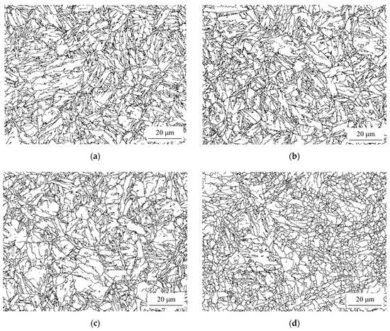 The steep drop in stress range of P91 during the first 10 cycles (Figure 3a,b) does not correlate to any visible sub-grain activity (cf. Figure 4a: 0 cycles to Figure 4b: 10 cycles) within the martensite lath structure. The decrease in stress range for this reason is caused by recovery of excess dislocations at the hot ends of the TMF cycles (cf. Figure 3c) alone. The start of degradation of the martensite lath structure appears in transition from the initial to the stable stress range section of the fatigue curve and becomes progressive with an increasing number of cycles (cf. Figure 4c: 250 cycles and 4d: 1250 cycles). Cyclic plasticization causes polygonization of the martensite lath structure. The resulting grain size distribution rather approximates that of the initial martensite lath width distribution (cf. Figure 4a–d) than the prior austenite grain size, which is in accordance with the results of [,,,,] acquired at other AFM steels under TMF loading.