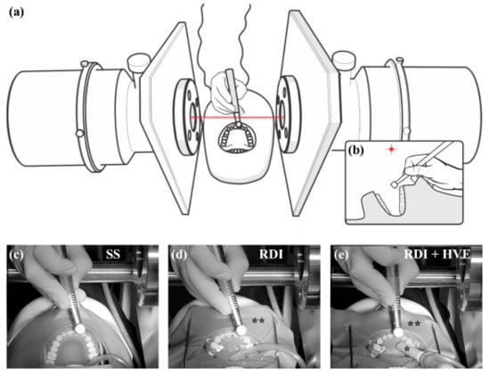- Holloman, J.L.; Mauriello, S.M.; Pimenta, L.; Arnold, R.R. Comparison of suction device with saliva ejector for aerosol and spatter reduction during ultrasonic scaling. J. Am. Dent. Assoc. 2015, 146, 27–33. [Google Scholar] [CrossRef] [PubMed]