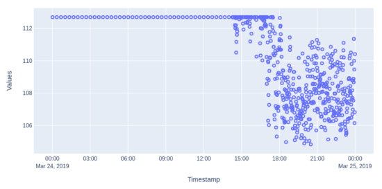 The system checks every minute if the value of the data point has changed enough according to a pre-established criterion (in this particular case, a difference with the prior data point higher than 0.5) to save that data point.