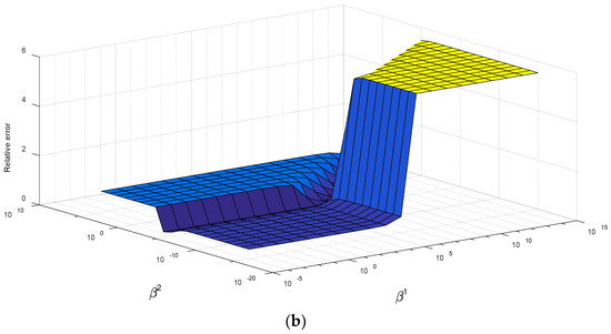 Figure 2 shows the changes in the correlation coefficient and the relative error for varying the values of when the signal noise ratio (SNR) of the response is 30 dB. It can be seen in the figure that the optimum range of values for is from 10−5 to 105, and, for , is a narrow band close to 104. In this range, the correlation coefficient is close to 1, while the relative error is close to 0. This suggests that the load identification accuracy is higher at this specific range of parameters . Clearly, the optimum range for is much wider compared to . Thus, choosing an optimum value for is our next concern.