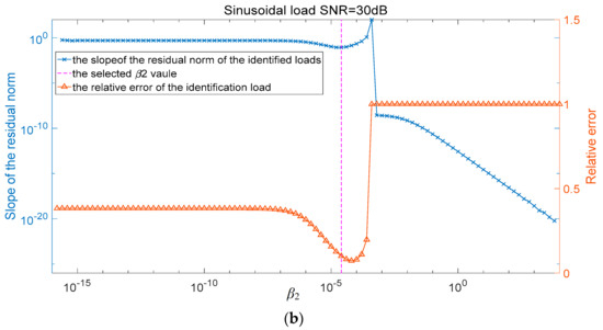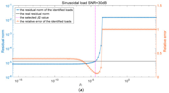 In Figure 3, the blue curve represents the slope of the residual norm, while the red curve represents the relative error of the identification load. The black curve gives the real residual norm according to the response noise level. The pink vertical curve represents the selected value corresponding to the minimum slope point of the residual norm. The red curve shows that the load identification error is ideal with the selected value. It should be pointed out, in this case, that the response noise level is 30 dB (SNR). Based on the above parametric study, we choose the following values for , respectively, while is determined according to the selection method shown in Figure 3.