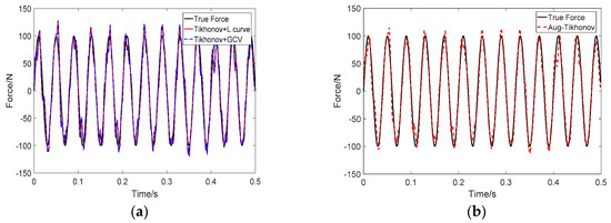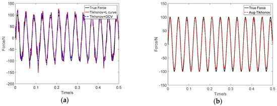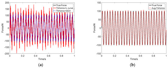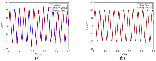 Identification result of sinusoidal load at SNR 30 dB: (a) Tikhonov method; (b) the proposed method.