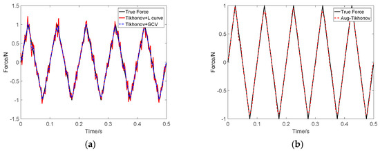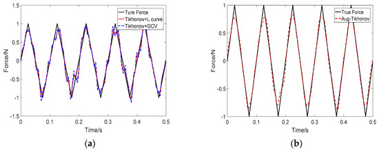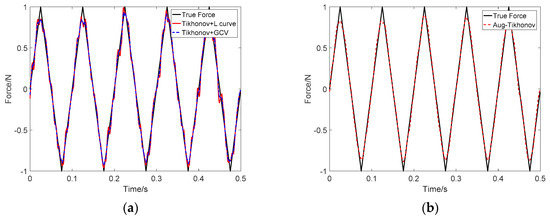 Identification result of triangle wave load at SNR 30 dB: (a) Tikhonov method; (b) the proposed method.