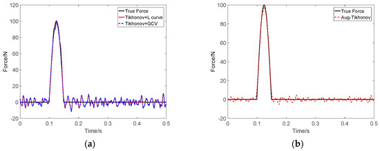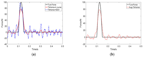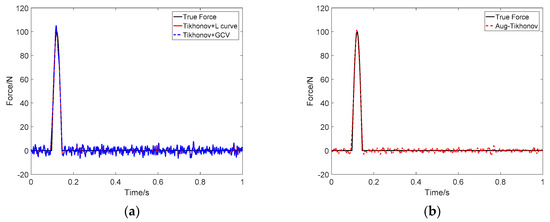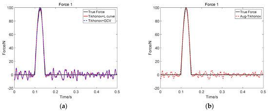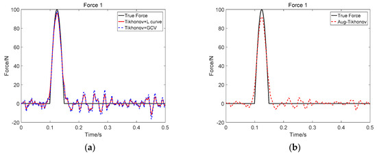 Identification result of two impact loads at SNR 30 dB (Force 1): (a) Tikhonov method; (b) the proposed method.