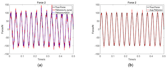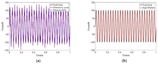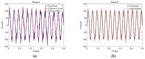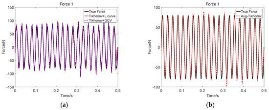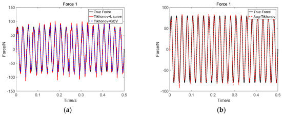 Identification result of two sinusoidal loads at SNR 30 dB (Force 1): (a) Tikhonov method; (b) the proposed method.
