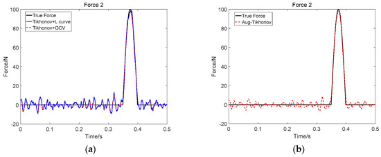 Identification result of two impact loads at SNR 30 dB (Force 2): (a) Tikhonov method; (b) the proposed method.