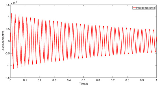 In this section, we aim to validate the proposed augmented method using experimental results. To this end, a load identification experiment for a simply supported bilateral beam is carried out. The model parameters are listed in Table 5. The natural frequency of the first four mode shapes are listed in Table 6. The frequencies are measured by modal experiment. To consider the model error and calculate the kernel function matrix, we build a finite element model and update it using the natural frequency obtained in the modal experiment. Table 6 shows the comparison of the natural frequency between the experimental results and the numerical results of the finite element model. The relative errors are evaluated based on the differences between the experimental and the numerical results. All the errors are smaller than 3%. Furthermore, for the first frequency, which is the most dominant, the error is less than 0.2%. These results verify that the finite element model is, in general, representative of the physical beam, and the numerical results are reliable. For demonstration, we show, in Figure 28, the displacements response obtained with the finite element model when an impulse load is applied.