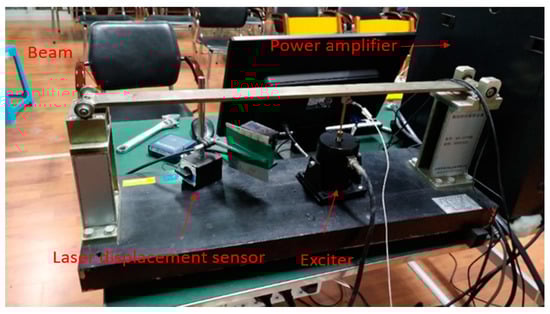 Figure 29 shows the experimental setting of the considered beam, while, in Table 7, we specify the used instruments. To apply a load on the beam, the exciter is installed at 0.42 m from one end. The force sensor is installed on the exciter connecting rod to measure the actual applied load. The laser displacement sensor is installed at 0.28 m from the beam end to measure the displacement response. A sampling rate of 4096 is used. Two different loads are applied. First, a sinusoidal and then a triangle wave signal is applied using the exciter. The load magnitude is adjusted through a power amplifier. The load applied is then recovered using the proposed method and the measured displacement. The identified load is compared to the actual load measured as by the force sensor.