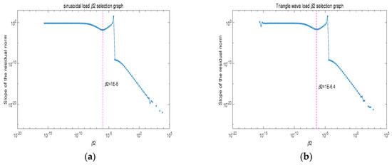 In real world applications, because the load acting on the structures is unknown, it is not possible to define the correlation coefficient and the relative error. Therefore, to determine the optimum values for the parameter , we use the relation between the parameter and the residual norm of the identified load. Indeed, in the load identification process, we rebuild the dynamic responses according to the identified load for a given parameter and then calculate the residual norm . When the noise level of the dynamic responses is known, we can find the optimum by comparing the real residual norm with the computation residual norm, which is shown in Figure 3a. When the real noise level is not available, we calculate the slope of the residual norm with respect to and then take the local minimum value as the optimum point of the parameter , as shown in Figure 3b.