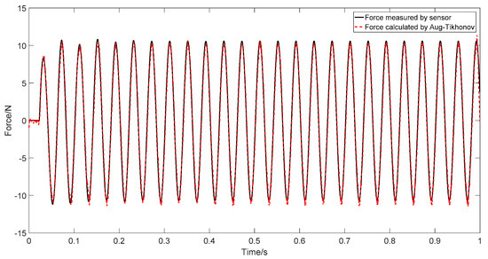 The regularization parameters are obtained following the procedure described in Section 4. Three types of force are studied: simple harmonic excitation, triangular wave excitation, and impact load. The load is only applied to the first degree of freedom. We assume the system initially has a stationary state, i.e., zero initial conditions. The sampling time interval is 0.001 s. The considered time span is 0.5 s. The load identification results of the three loads with the SNR of 40 dB, 30 dB, and 20 dB are shown in Figure 5, Figure 6, Figure 7, Figure 8, Figure 9, Figure 10, Figure 11, Figure 12 and Figure 13. On the left side of these figures, we show the results obtained with the Tikhonov regularization method, and, on the right, we show the result of the proposed augmented Tikhonov regularization method. The identification result errors are shown in Table 1.