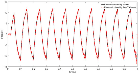 Equation (8) is the linear equations in the case of multiple inputs and outputs, and the unknown force can be obtained by solving this equation. Clearly, Equations (6) and (8) both conform to the form of . The inversion of equations in this form usually introduces a significant error into the solution due to the ill-posedness of the problem that is caused by the ill-posedness of the kernel function matrix , especially for large systems, i.e., hundreds of degrees of freedom. Next, we discuss reducing the ill-posedness problem using Augmented Tikhonov regularization method.