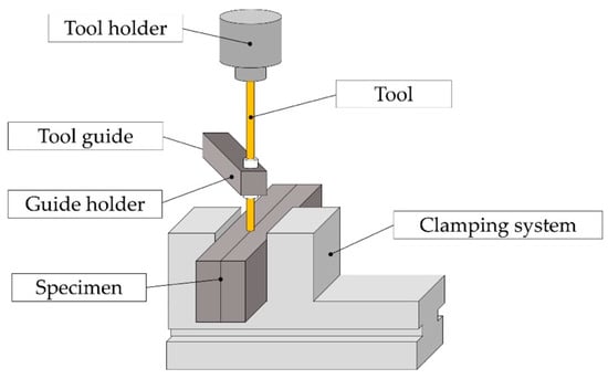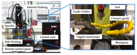 Brass tubular tools of small diameter are rather flexible. For this reason, a tool guiding system is used to reduce the run out of the tool electrode when approaching the workpiece. This guiding system consists of a ceramic tool guide and a guide holder, as shown in the magnified view in Figure 1. During the experiments, the guide holder is positioned such that the ceramic guide is above the top surface of the workpiece at a distance of approximately 2 mm.