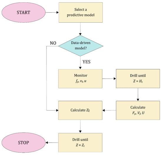 where At is the cross sectional area of the tool electrode and Tp is the monitored drilling time at Z = Ht. The value of Zt is computed when Z = Ht if the DD or DD + PP predictive models are chosen, while Zt is computed at the start of the drilling process when selecting the PP predictive model. After computing Zt, the drilling process is continued until Z = Zt is reached.