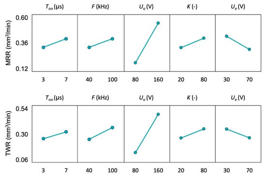 Main effect plots of the investigated processing parameters on the material removal rate (MRR) and tool wear rate (TWR).