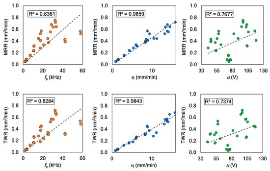 Correlation plots of the average amount of normal discharge pulses per time unit (Fp), average tool feed rate (Vf), and average gap voltage (U) with the material removal rate (MRR) and tool wear rate (TWR). In each graph, the data points are the average values computed at the end of each drilling experiments and the dashed line is the linear correlation line. The coefficient of determination (R2) is also shown.