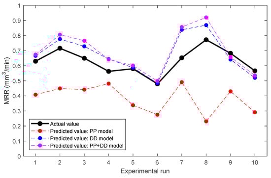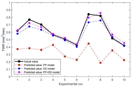 The predictions of the MRR and TWR for the three predictive models are shown in Figure 6 and Figure 7 respectively. When comparing the performance of the DD or DD + PP models with that of the PP model, an improved pattern can be seen. This suggests that, when including the data collected through process monitoring, the prediction is more accurate than when only considering the processing parameters. This is because many factors influence the material removal process besides the set of processing parameters, which is given as input by the machine user. An example is the flow field generated by dielectric flushing, which determines the temperature, pressure and velocity distributions within the discharge gap [,,]. The effects of the flow field have been illustrated and analysed by physical-based models and calculated by finite element methods [,,], showing to have a significant impact on the material removal process by electric discharges. The combination of thermal and electric action in material removal also influences the discharging process []. The improved prediction when using data collected during the drilling process shows that data-driven predictive models are capable of considering the effects of other influencing factors besides the processing parameters.