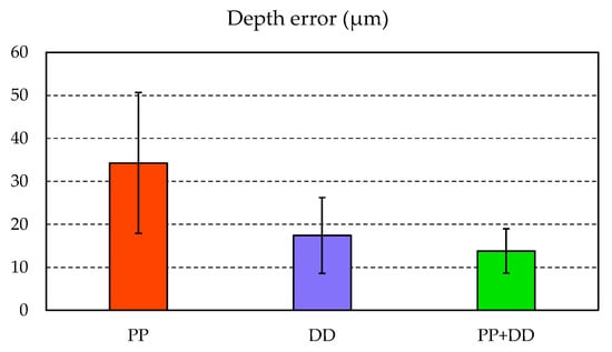 In order to further study the capability of the different predictive models, the micro-EDM drilling experiments were repeated 7 times for each predictive model, for a total of 21 drilled holes. The depth errors for each predictive model are shown in Figure 9. The average depth error when applying the PP + DD model is the lowest. It is roughly 50% lower than the average depth error for the PP model. The deviation between the results is also significantly lower when the PP + DD model or DD model are applied instead of the PP model. The results show that implementing PP + DD or DD model into the control strategy has a clear improvement both on accuracy and precision of the drilling process if compared to the PP model. This demonstrates the significance of data-driven approaches for robust in-process monitoring and controlling strategy in micro-EDM drilling.